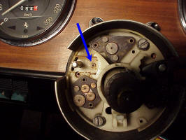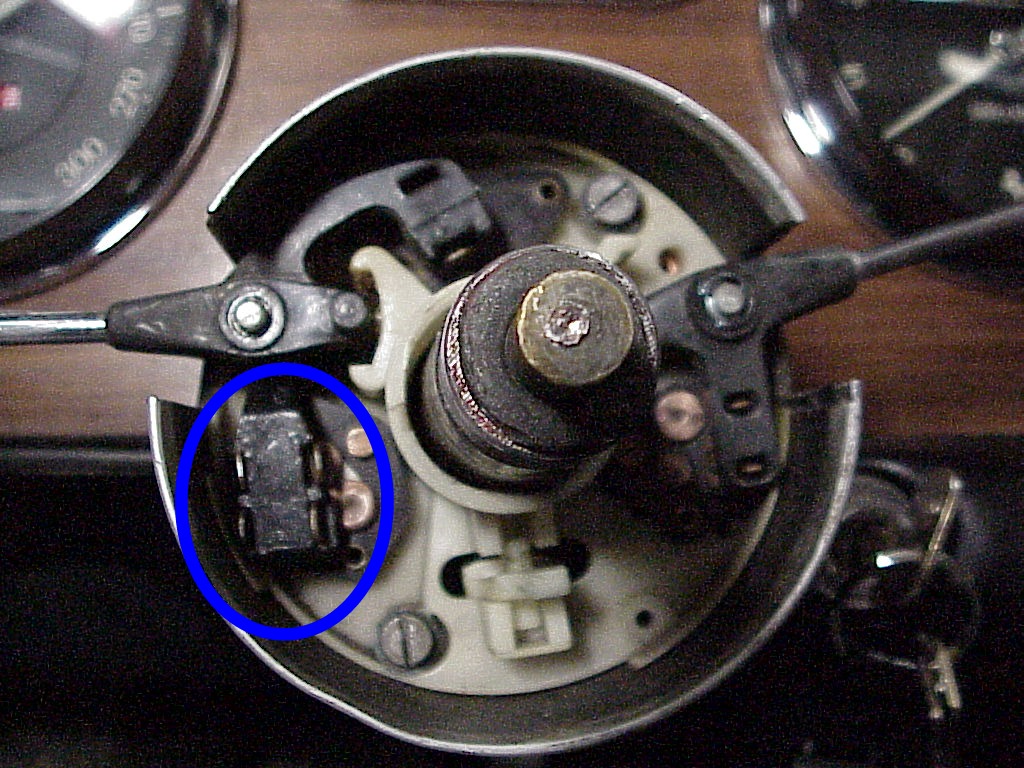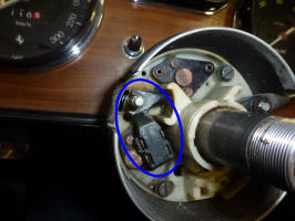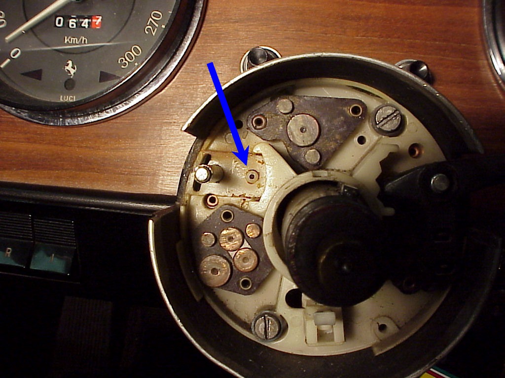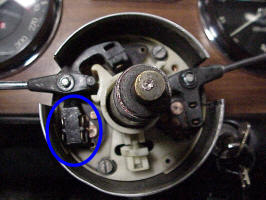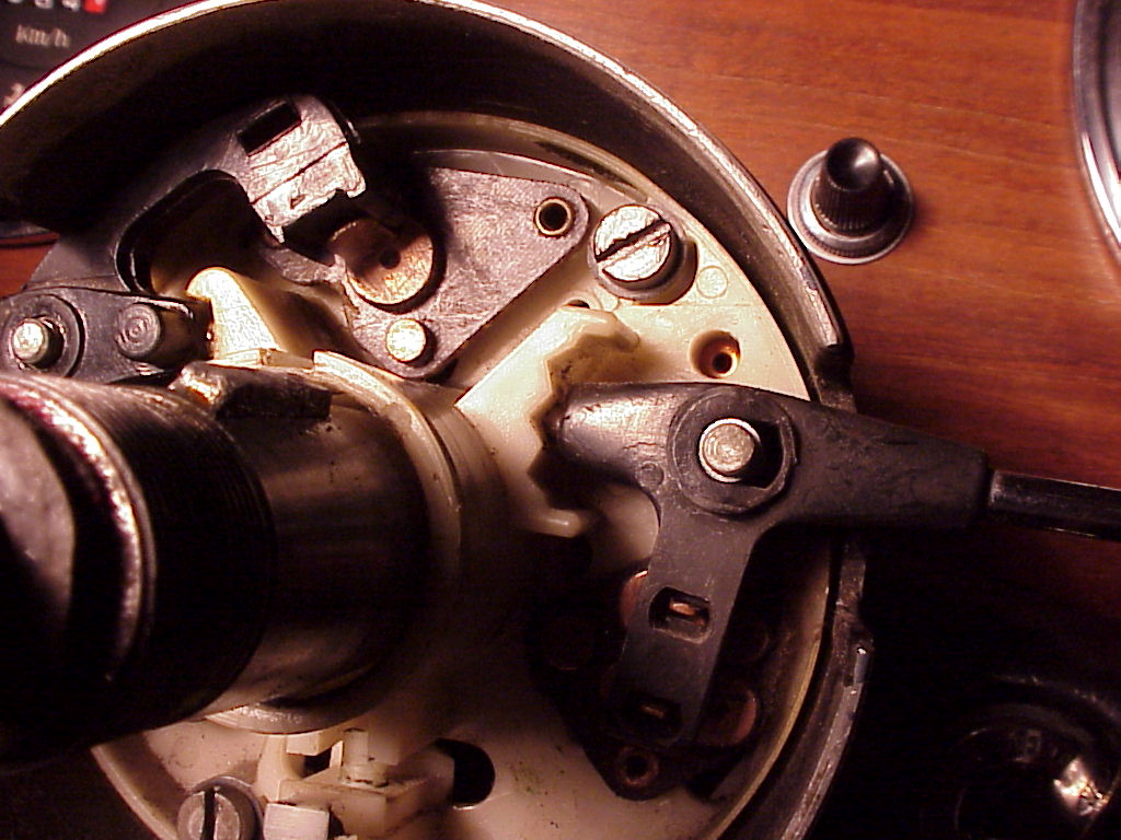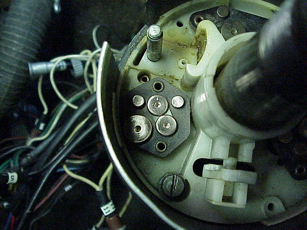 Now you can see the contacts that make all of the electrical connections. The lower left ones are for the headlights, the ones at the top are the turn signals and the wiper ones aren't visible, but are in the dark area on the right side. A good cleaning and a little sanding with emery cloth will help keep the connections in good shape. The arrow points to the switch that flashes the headlights. As you pull the headlight switch handle towards you, the other end pushes down on that nylon button which actuates the flash switch.