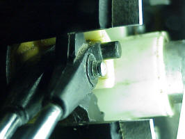 The second thing I learned was that the shaft that the stalks pivot on can be pushed down through its mounting thus effectively making it shorter. After I had thinned the stalk end, I came back and was confused as to why things wouldn't fit. At first I though that the spring loaded ball was keeping the stalks from fitting down as far as they had been when I did my original measurements. So I took everything apart again and noticed that the end of the shaft was lower. A quick pull by a pair of pliers restored its length and I was able to re-assemble everything properly.