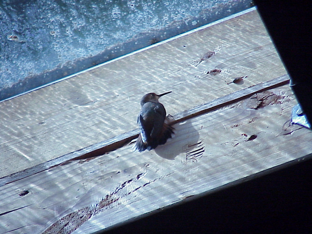 During this process, I had the bay door open for some more light. As I was down at the far end using the heat gun, I heard the tiny tut-tut that a hummingbird makes. I've had a couple of hummers fly in before so I went looking up at each skylight.