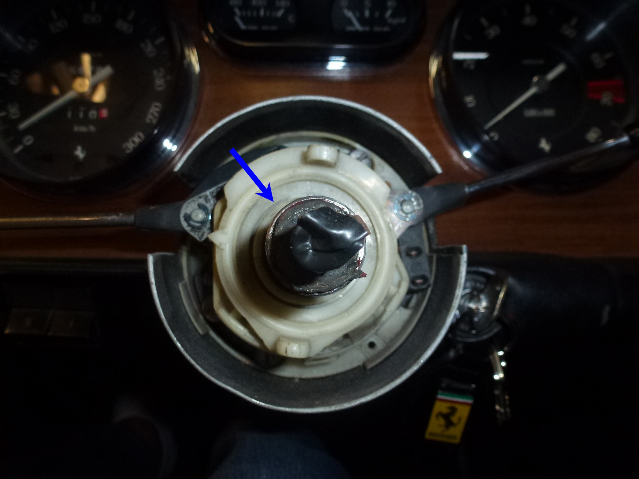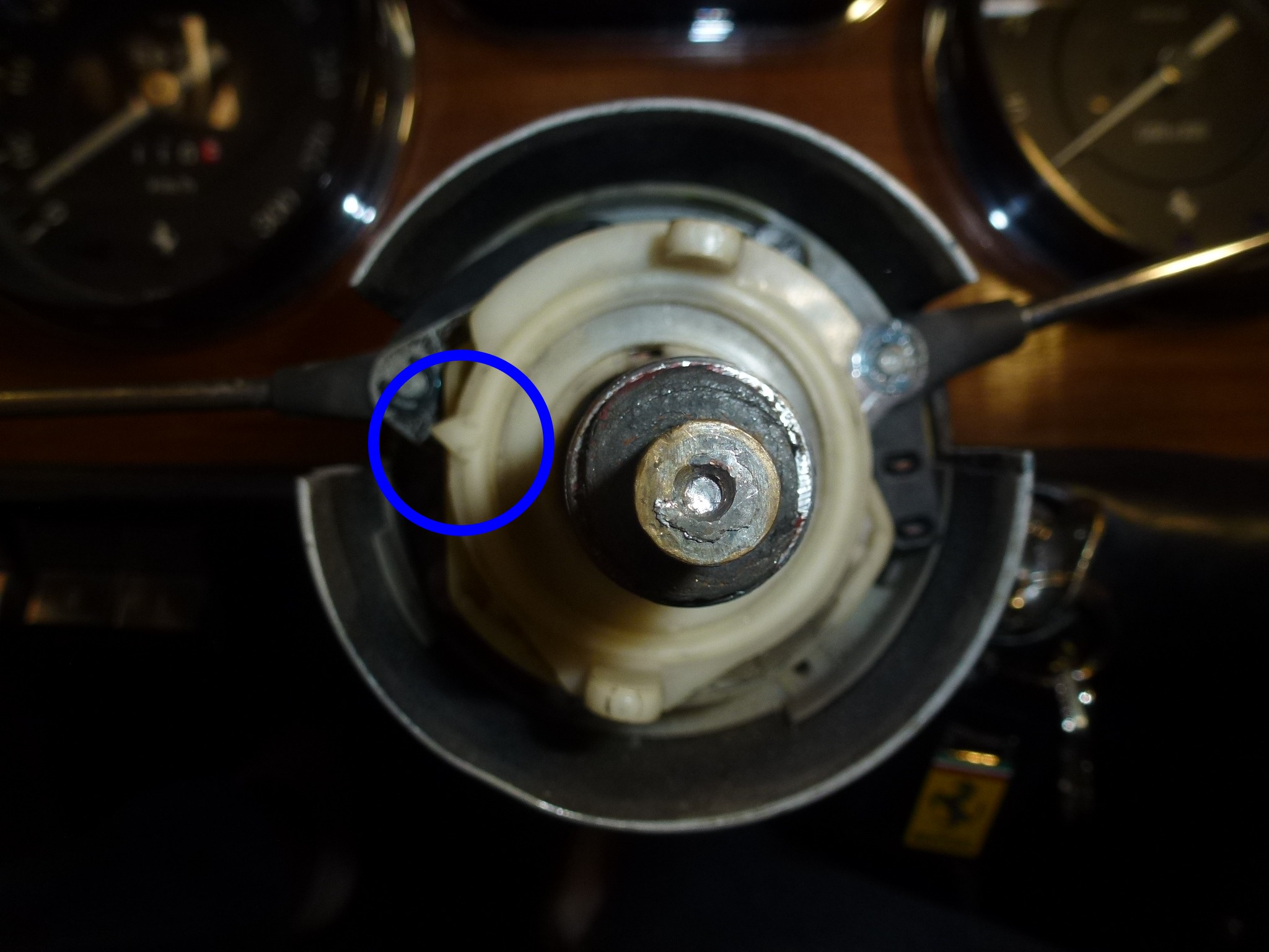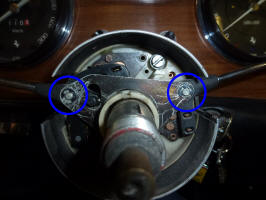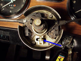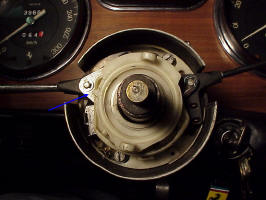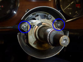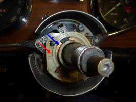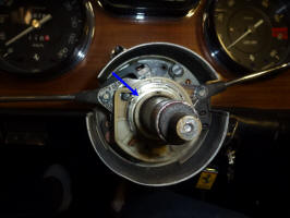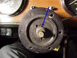 Of course it wasn't quite that simple. To get at the part to remove it, you have to remove the steering wheel, the horn button and the hub that the steering wheel bolts to. The hub is held by a nut with slotted sides (that accept a tabbed washer that locks it in place).