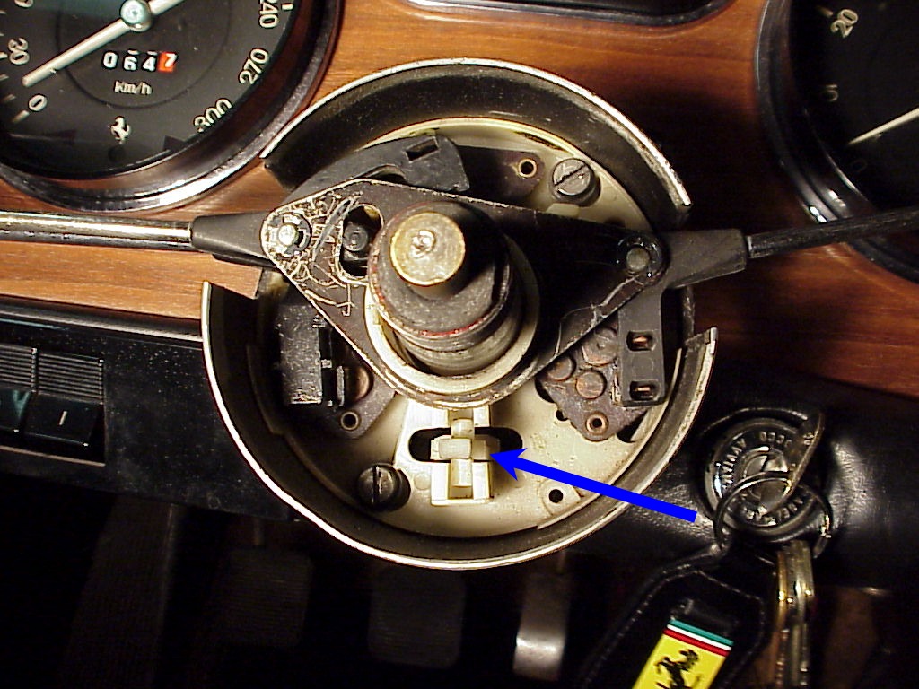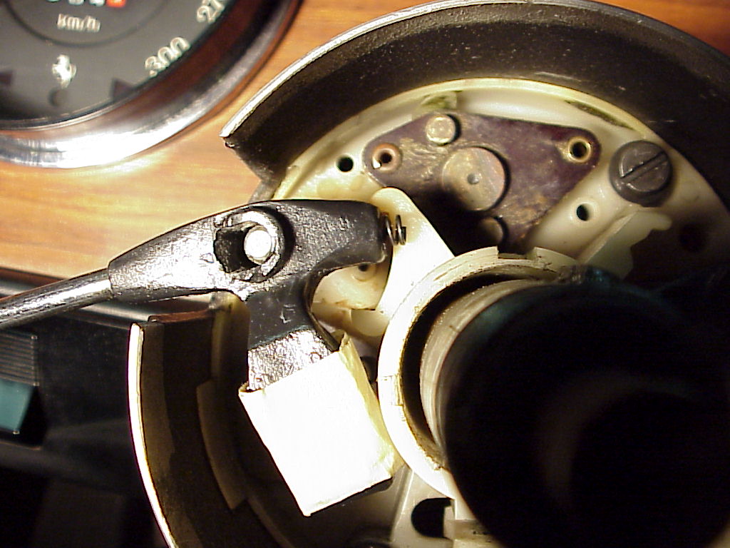 Then pull off the plastic part that returns the turn signal lever to off after a turn. Note the location of the arrow so you can align it correctly later.