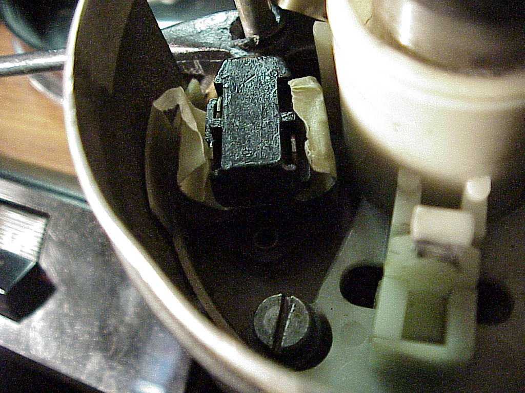 Here you can see the contacts taped with two layers of masking tape (stuck together so they won't stick to the either side). The spring where the ball bearing goes is just above the center of the picture.