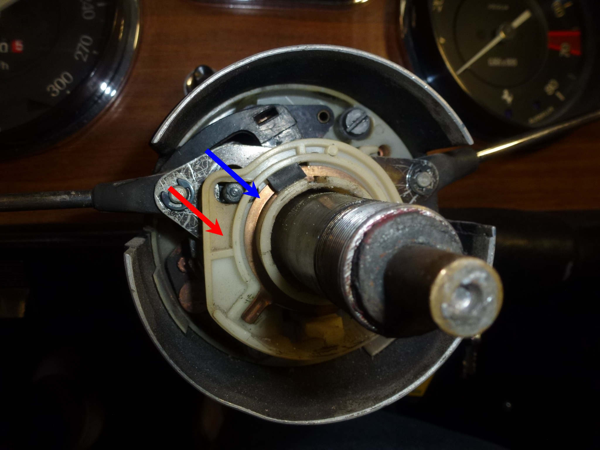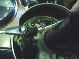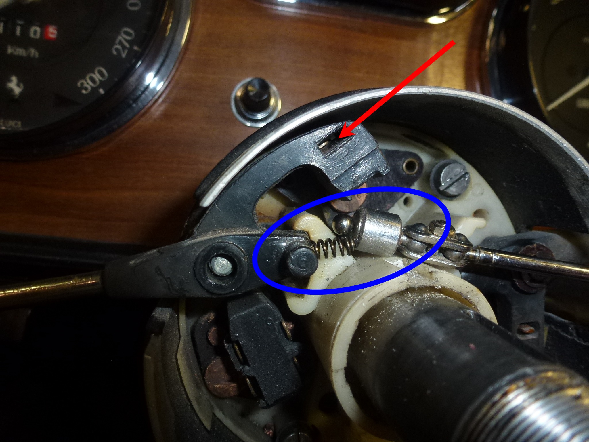 Remove the turn signal stalk. Note the stick magnet in place catching the ball and spring that is in the end of the stalk. If you rotate the stalk the same time as you pull up, the stalk comes up easier when the ball is no longer in a detent. There is also a spring loaded U-shaped electrical contact (red arrow) that wants to come off, so don't lose it or the spring. The second picture show the contacts on the headlight stalk.