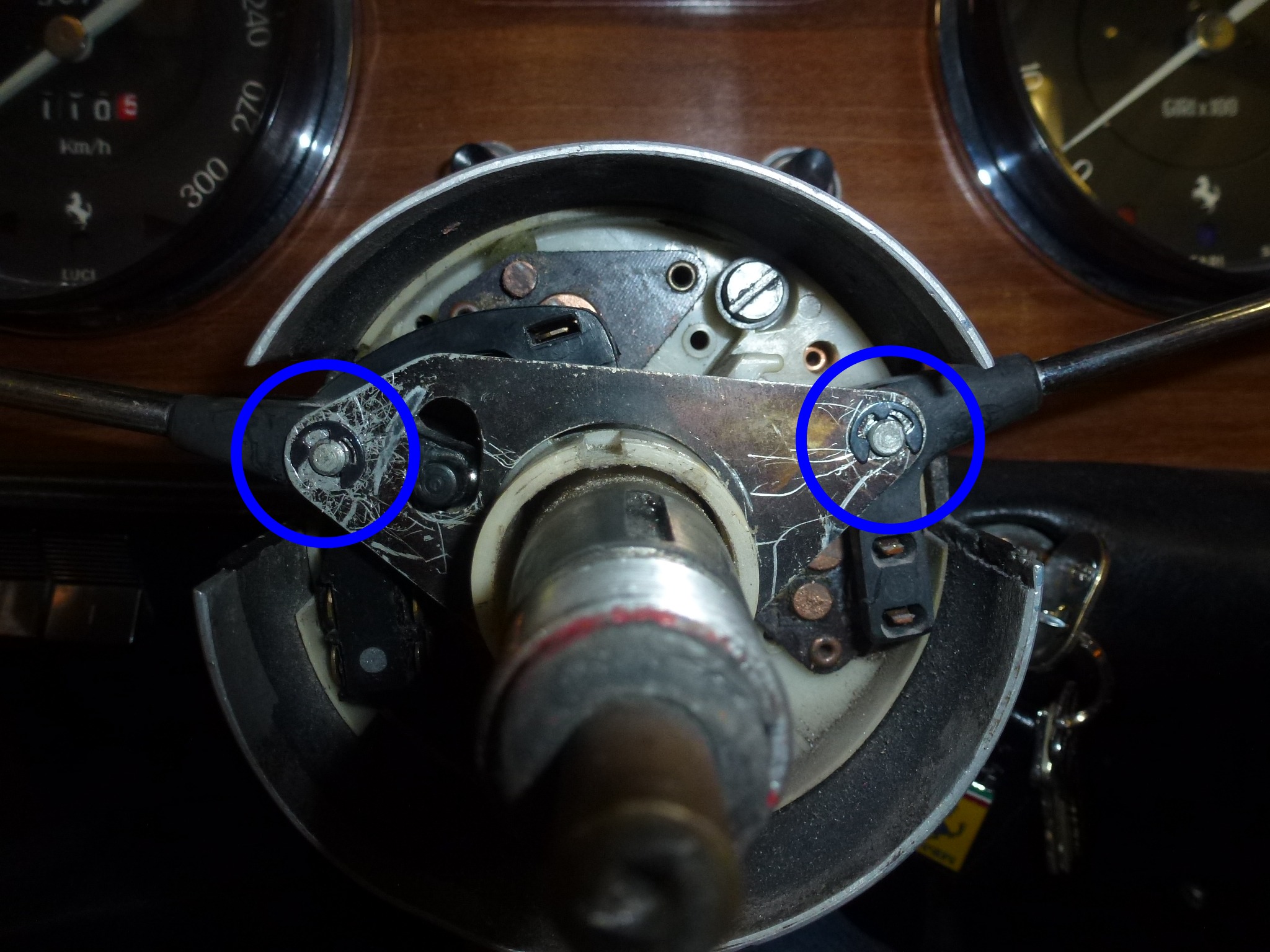 Putting the handles back on the switch assembly is also an exercise in futility. Each handle has a spring loaded ball bearing that clicks into indent places in the assembly. This is what holds the switch in each location. Each switch end also has one or two U-shaped pieces of copper that make the actual contacts. These are also spring loaded so they push down on the contacts. So you have 3 spring loaded pieces that all want to come apart as you are trying to put everything together. You can tape down the contacts, but the ball bearing has to be loose. I had the it fly off several times when I was putting trying to put the arms on. One time, I couldn't find it, so I emptied the shop vacuum, vacuumed the whole car, including every nook and cranny. After that, I went through the canister and found the ball bearing. If you do lose one, they are 3/32" in diameter and can be obtained at a good hardware store.