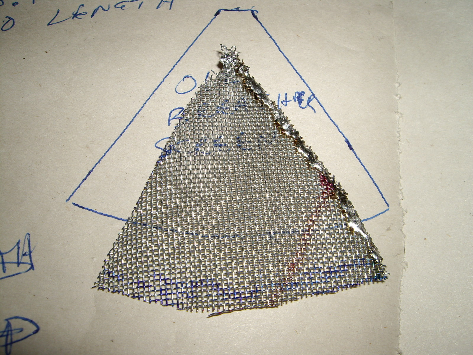 Then I cut out a triangle of screening to make into the cone. It took a couple of passes before I got the right dimensions so the cone looked good and fit into the steel ring. I practiced soldering one edge on one of these early pieces.