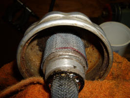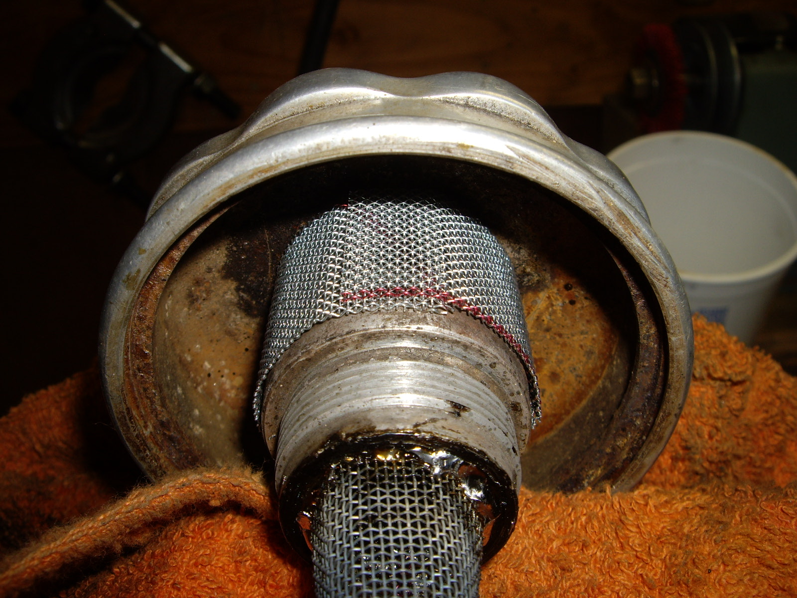 The whole cap is aluminum except there is a steel ring inserted in the middle to solder the screening to. This ring is staked into the aluminum cap and I decided to not try and remove it, though that would have made the soldering easier. Instead, I used a propane torch to heat the ring enough to remove the remnants of the old screen, cleaned off the old solder and re-tinned that area.