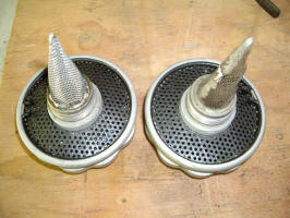 Then I rolled it into a cone using a wide bladed vise grip pliers designed for welding. A little adjusting got it to fit into the ring properly. Then I tinned the bottom edge of the cone and re-heated the ring. Once the solder in the ring was liquid again, I placed the cone into the ring and let it cool a bit, just until the solder hardened. Then using a soldering iron, I added solder as needed to fill the gap between the base of the cone and the ring. After everything had cooled, I then soldered up the joint to the tip of the cone. Here's the one with the original cone intact and the one I just fixed.