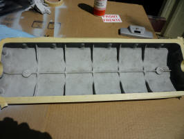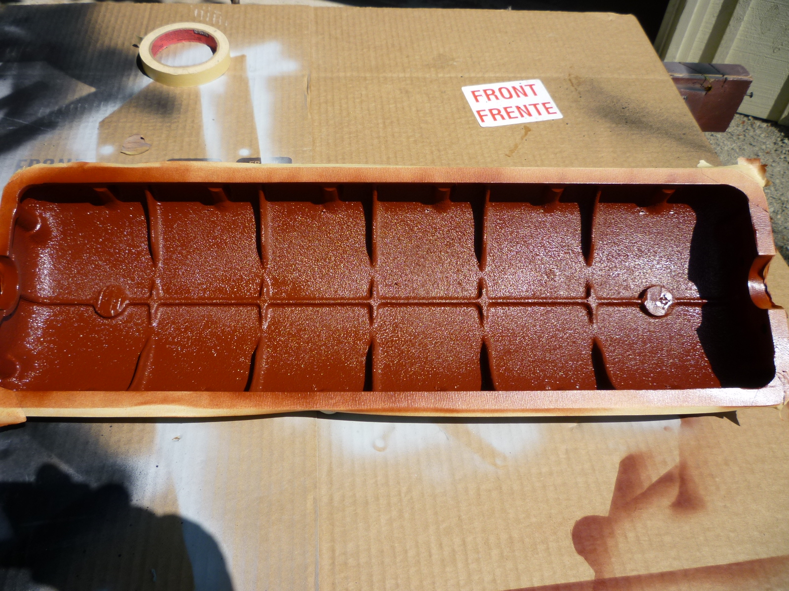 A while ago, I spent some time sand blasting the old paint off. One issue with Ferrari valve covers is that they tend to be porous, so one has to seal the inside with Glyptal, a sealer used in the electrical industry to coat wires used in transformers. This is available for brush application or in a spray can.