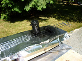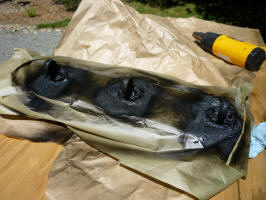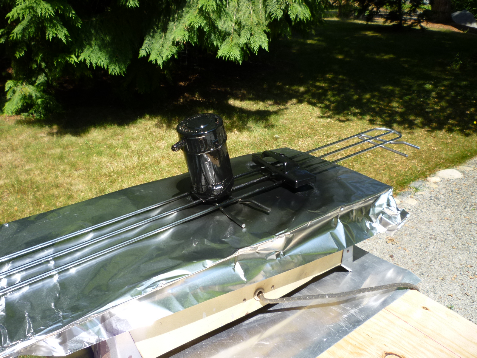 After that, it was time for the wrinkle paint. Today was a hot day (in Seattle, that means over 80°), so I took the opportunity to get some wrinkle painting done. Not trusting that the sun would be enough, I also used a hot plate. Here you can see a horn compressor getting its coating.