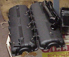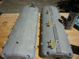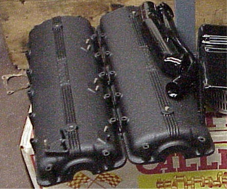 As I've mentioned before, the valve covers that came with the car didn't fit (5 studs/side vs. 6 studs that were needed). I swapped covers with Tom Shaughnessy last fall when I went down on a parts trip. Here are the ones that came with the car. You will notice only 5 holes per side, but they were very nicely wrinkle painted.