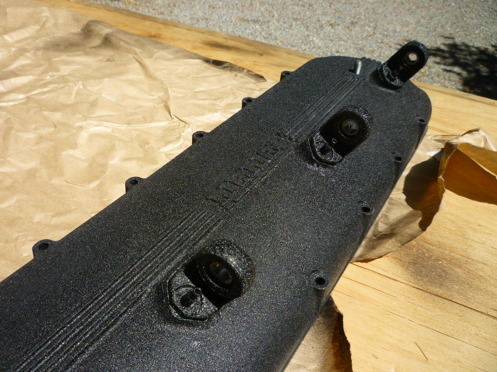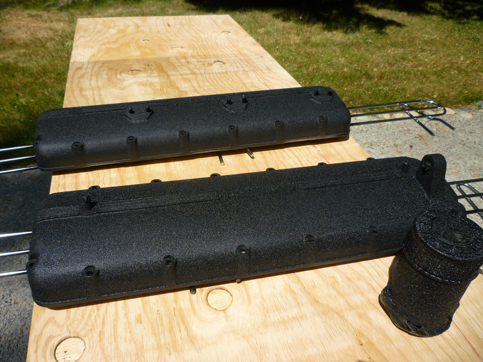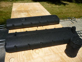 I was quite pleased with how they turned out. I used the Eastwood wrinkle paint, following their directions of a heavy coat followed by a second heavy coat 3 minutes later. Obviously it was hot enough as the first coat started wrinkling on one valve cover as I was spraying the second coat on. I got a nice tight wrinkle that was even overall.