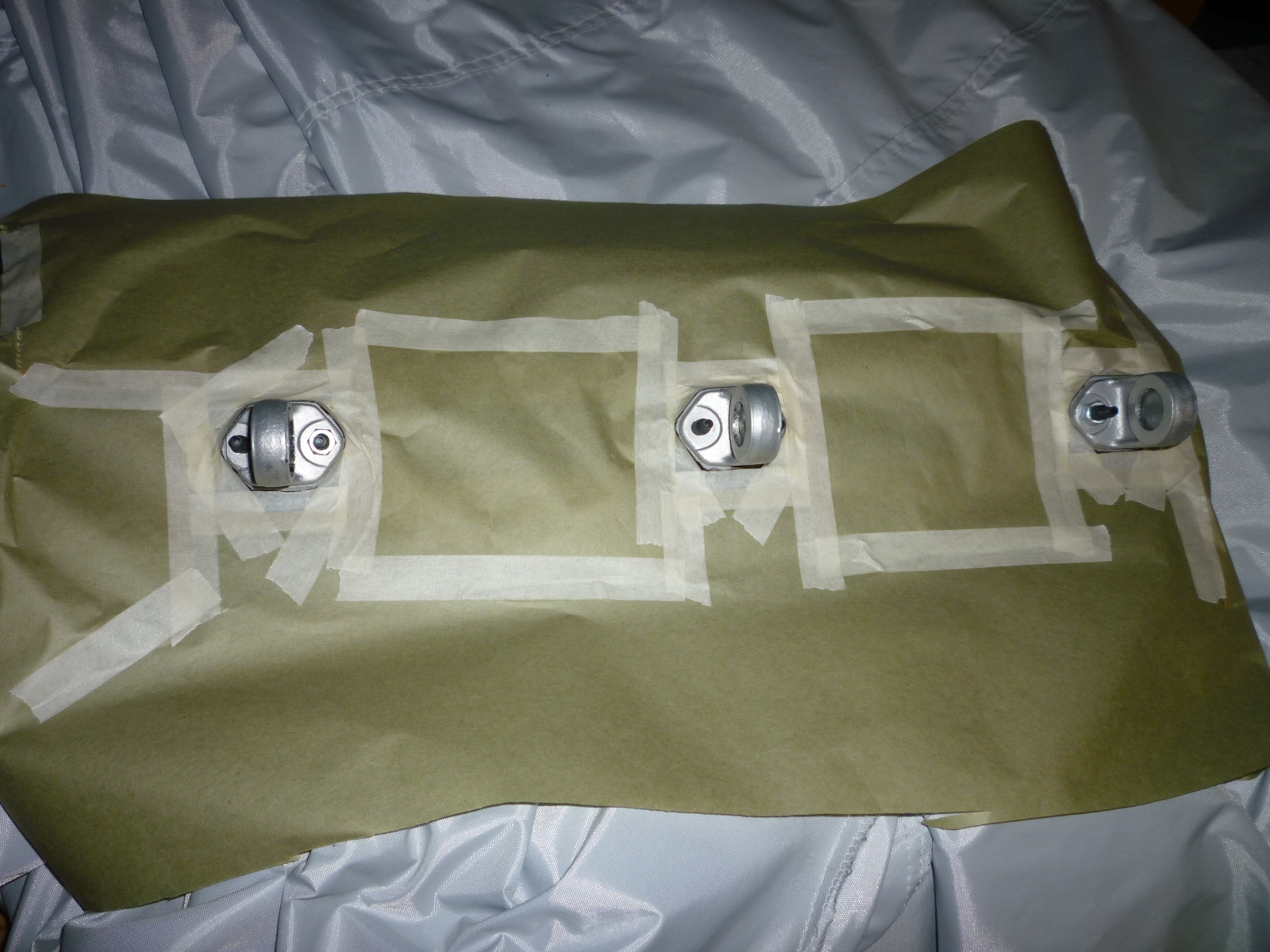 One thing I did this time was to use an ultra sonic cleaner after bead blasting the supports to clean the bearings (they are staked in, so non-trivial to remove). Then I greased them and used large hole punches to cut duct tape to cover each side. Much neater than covering the support and trying to cut away the excess tape. I helped out with the heat gun to make sure I got a good wrinkle. I was worried that the bases wouldn't wrinkle the same since they were bolted to the valve cover which would act as a heat sink. I also wanted to remove the paper and tape as soon as possible so there wouldn't be a line at the old and new paint surfaces. Between the heat and over spray, the adhesive on the masking tape was ready to peel off, so it was easy to get the paper off without touching the soft wrinkle paint surface. Here's the valve cover before, during and after the wrinkle painting.