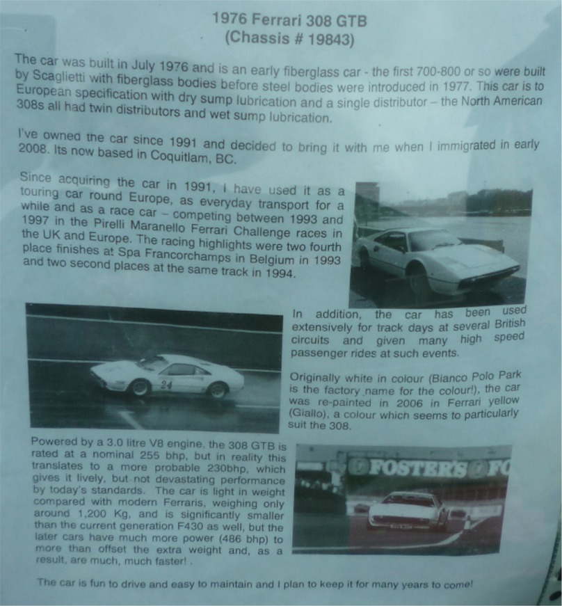 One of the more interesting cars there was a RHD fiberglass 308. This was a European car with a dry sump engine. I imagine that there were only a handful built in RHD before Ferrari switched to the steel bodies. If you click on the write-up picture, you can read some history on it.