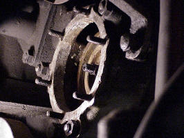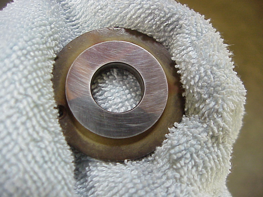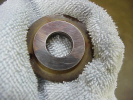 Upon disassembly, the old carbon seal looked fine, but there were several grooves in the washer. I hadn't replaced the washer when I rebuilt the engine nor had I done anything to smooth it out. So the new carbon seal never seated properly against the washer, thus it leaked. Here you can see the grooves.