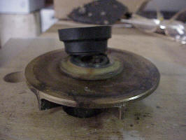 Another thing to worry about is the small rivet that holds the sealing washer to the back of the impeller. This is no longer available. After talking to several people, I decided to use a small piece of brass brazing rod and peen both ends so it would act like a rivet. First I had to take the rod and file and sand it down to the right diameter. I cut off a short piece and chucked it in the drill press. Then I just used a file while the drill press was turning the rod. Once it was close, I changed to emery cloth for the final sizing. It turns out that the hole in the washer is slightly larger than the one in the impeller. So I ended up tapering the rod slightly. I drove it in from the washer side first and peened over that end. Then I cut off the excess by using a cut-off wheel on a die grinder and peened over the other end.