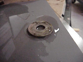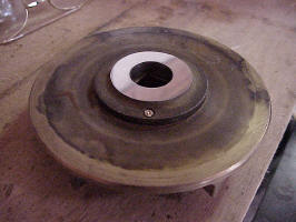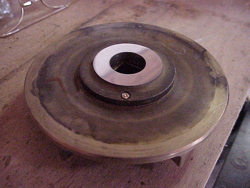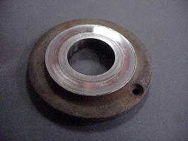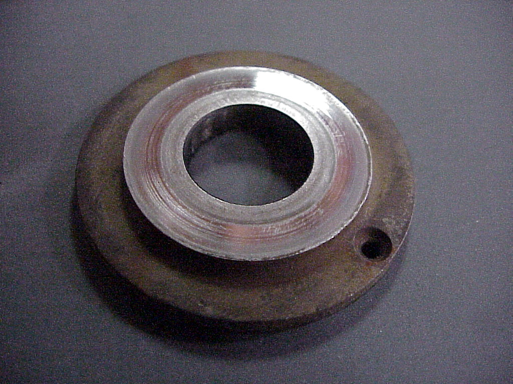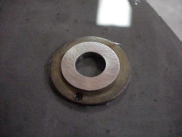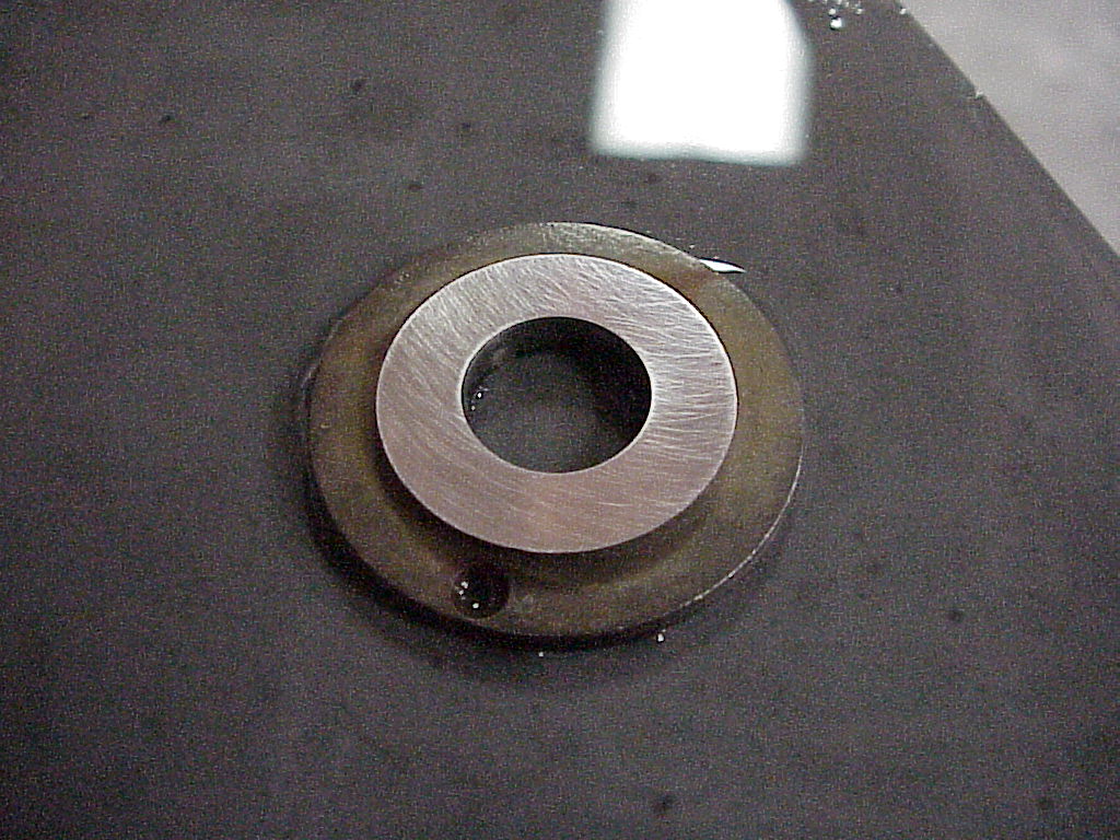 So this time I took the washer and sanded out the old grooves. In order to do this and still keep the face flat and parallel, you sand it by rubbing on wet or dry sandpaper (used wet) that is laid on a sheet of glass. The glass is very flat and if you keep even pressure on the washer, the whole surface is sanded down evenly and kept flat.