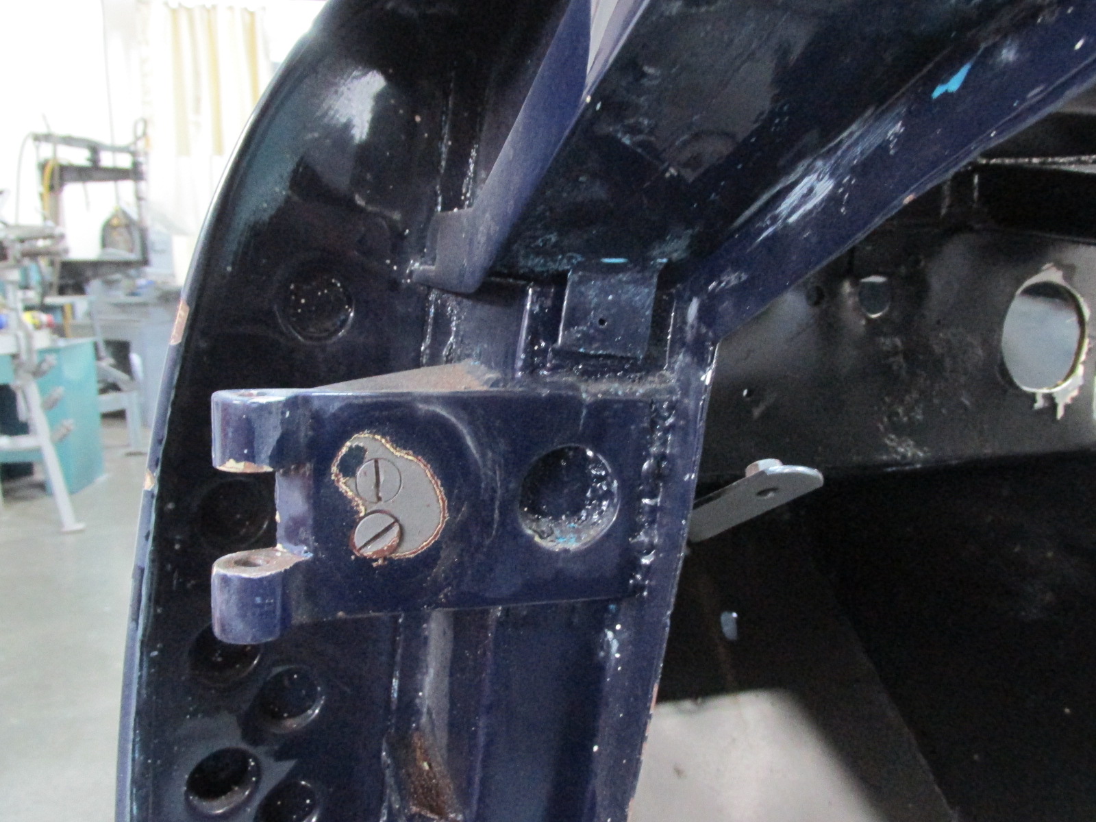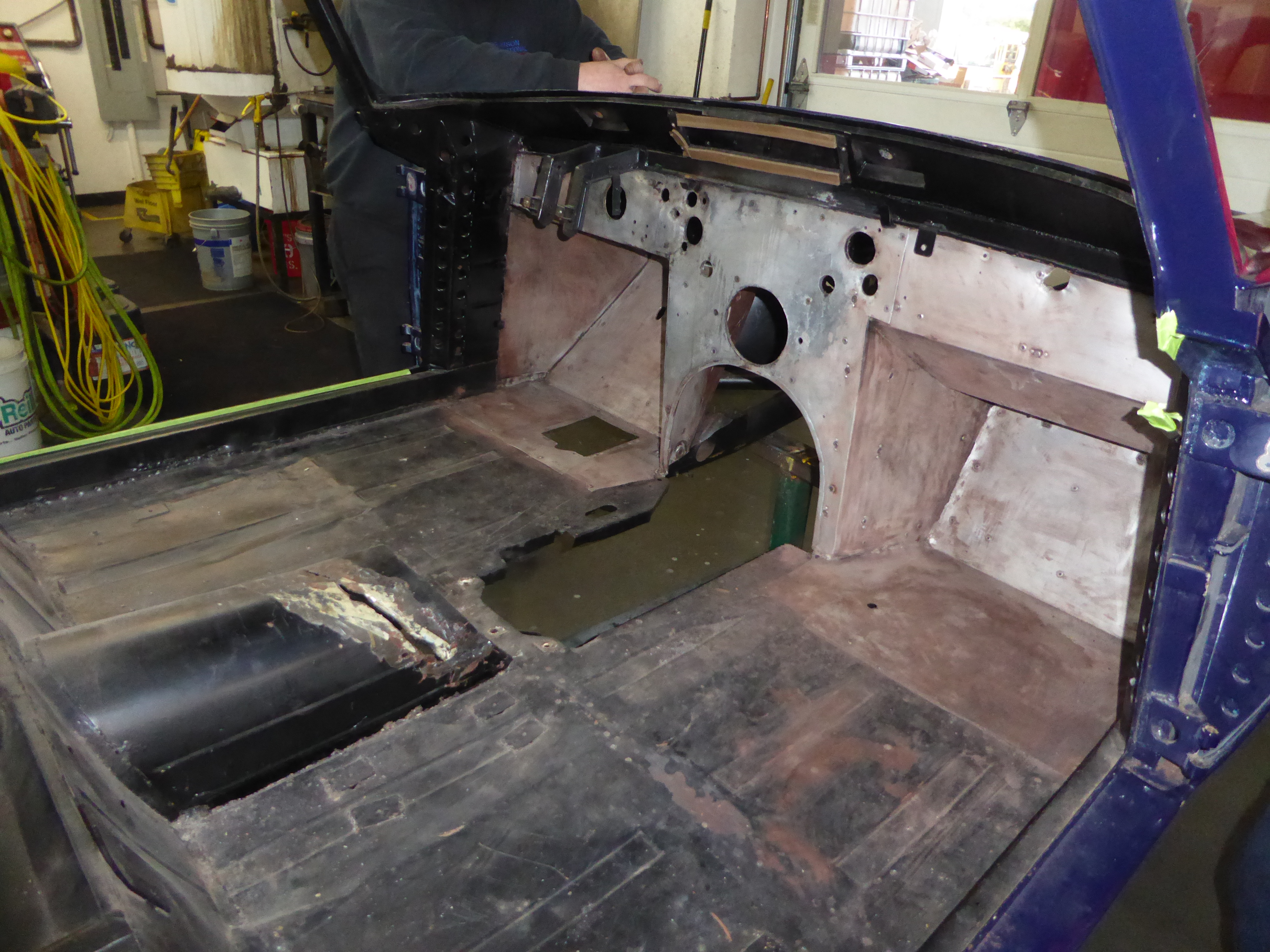 As the interior was stripped, a cut was found in the sheet metal behind where the tunnel ends. It looks like someone needed to replace a seal in the rear of the over drive and rather than pulling it, simply used a torch to cut and fold it back to allow working from the top. Afterward, they just unfolded it and welded the cut end down. I'll have Dennison straighten the fold and weld the slot up. It would have been a lot nicer if they had used a Sawzall to have made a much neater cut.
