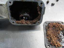 The steering box was disassembled and will be put back together with new seals. The adjustment screw cone had frozen in place, so the sides were worn. That will have to be machined smooth again and lubed so it rotates properly. Here you can see the before and after pictures.