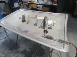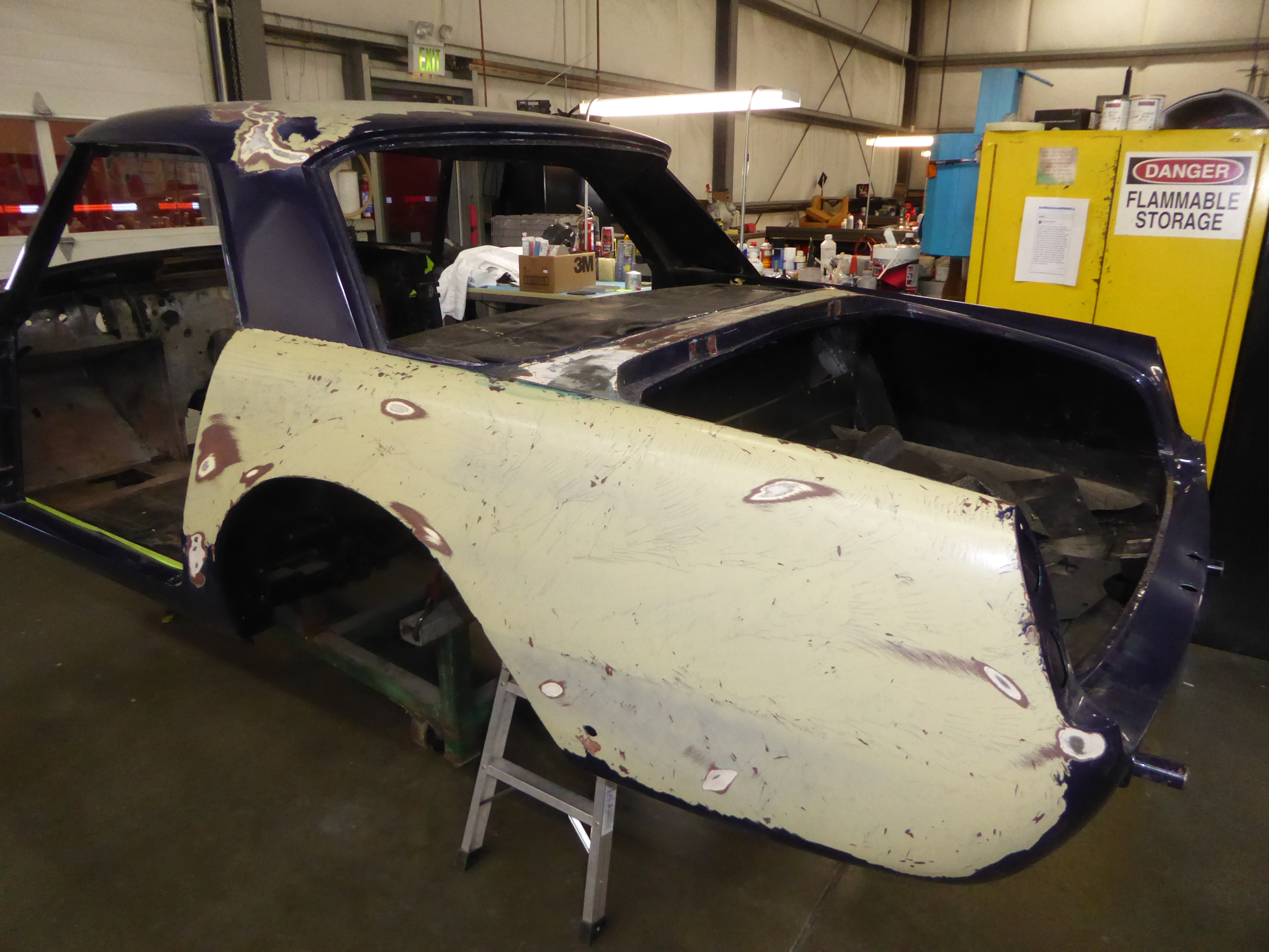The rest of the car was readied to be sent out for mechanical stripping of the paint and filler. A few places were spot checked to see about the amount of filler used. The overall lines looked pretty good, but there are areas where an 1/8" of filler is present. It will be interesting to see how much sheet metal work will be needed to have a minimal thickness of filler used to give the correct lines.