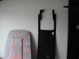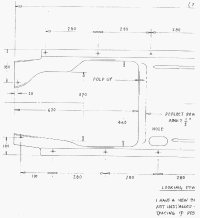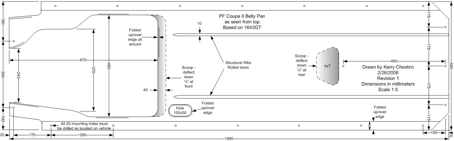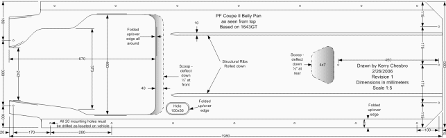 One can see the rear scoop in the lower part of the picture, but I'm not sure of the exact size nor how far down it should stick. When I was confirming the dimensions on my PF coupe, it was clear that the rear corners would hit on some of the chassis stiffening. I've drawn the corners cut off at a 45° angle, but maybe they should be shaped with a quarter circle cut like the front corners are.