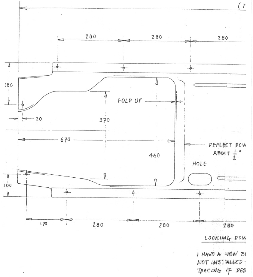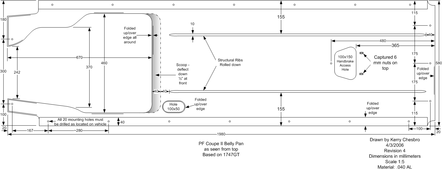 I was able to verify the measurements on Ed's belly pan and take some pictures of various details. In addition I removed the handbrake access panel to verify how it bolts on. As I suspected, one bolt goes into the handbrake fitting while the other two have captured nuts on the top side of the belly pan. Here is the revised drawing.