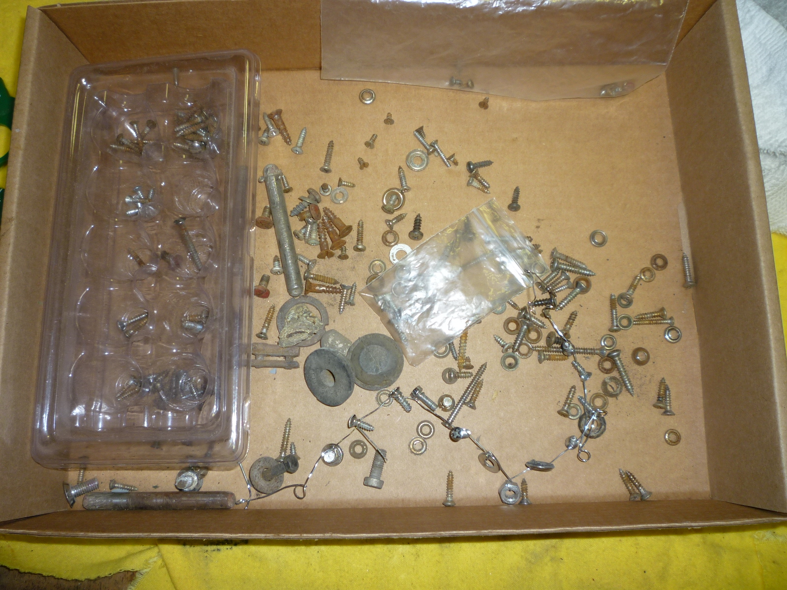 I have a last collection of trim screws accumulated from both PF coupes. However, with few exceptions, they are not labeled as to where they came from. So part of the effort was sorting them by type and size and then counting each group. That way, if a particular piece of trim needed six screws and several sizes would work, the group with six would get the nod. However, that presupposes that they were all alike to start with and further, some of them could have come from either car.