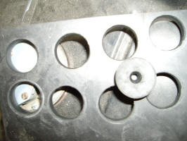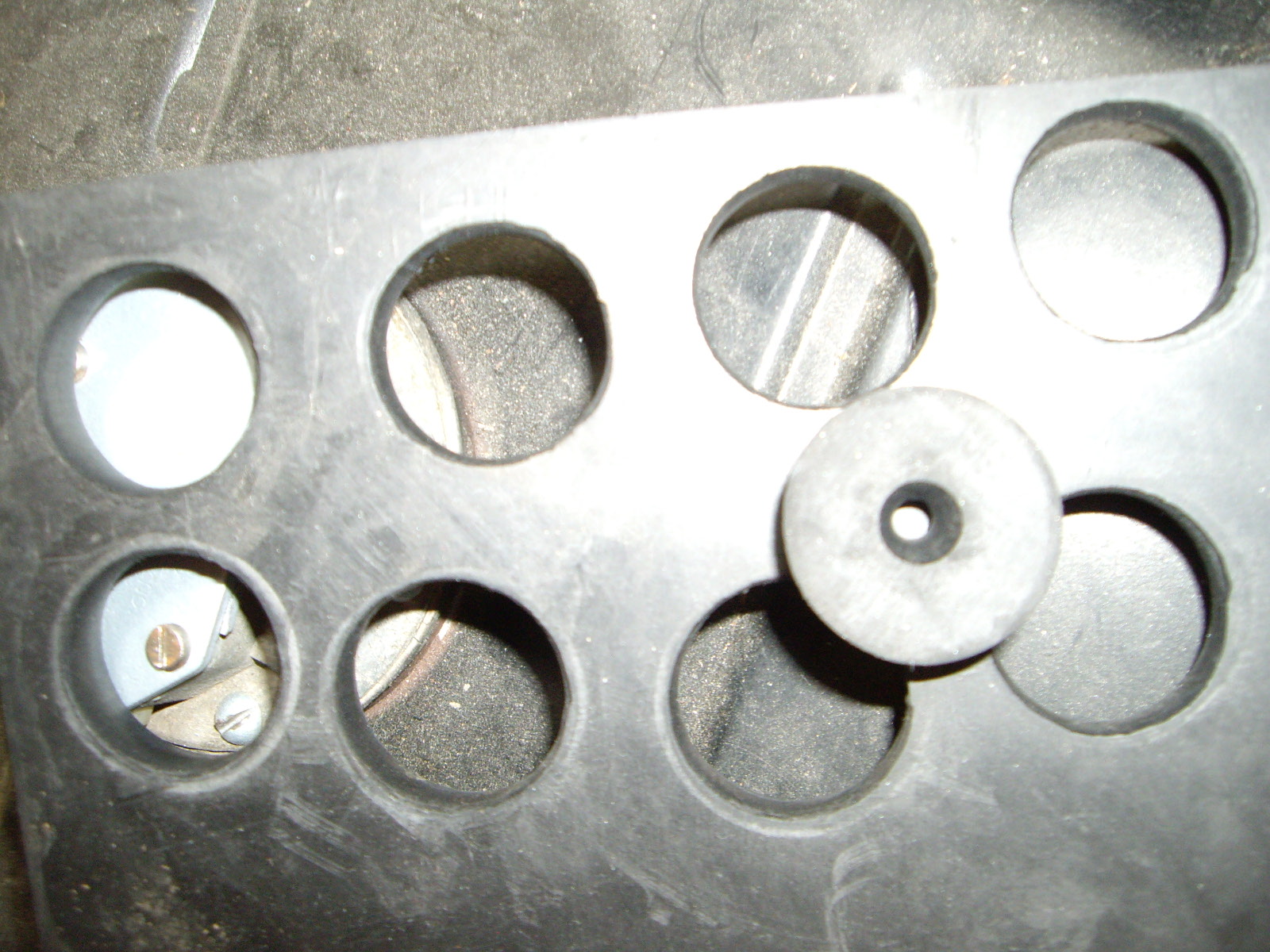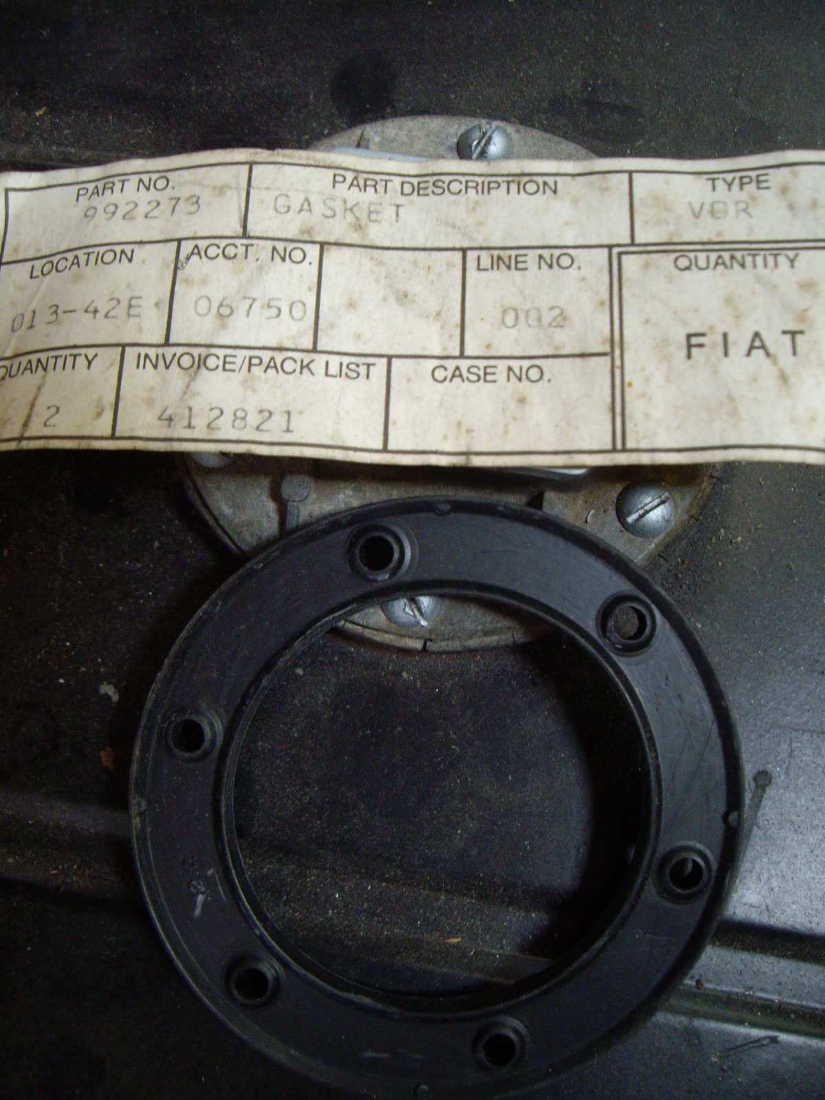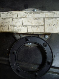A friend of mine is also working on his PF coupe. He had the gas tank out and was looking at the gasket with a Fiat friend of his. The friend said that the gasket was identical to a Fiat part (992273), so George got one for me too. I hadn't changed my gasket since I didn't think that a new one would be available. Now I was able to put a new one in. The other thing I needed for the fuel tank was the rubber isolating washers that fit above and below the flange. I bought a piece of 1/4" rubber from McMaster-Carr and my brother-in-law who works in a shop with a large press punched out the 1" diameter pieces that I need.