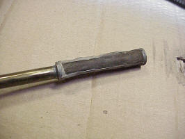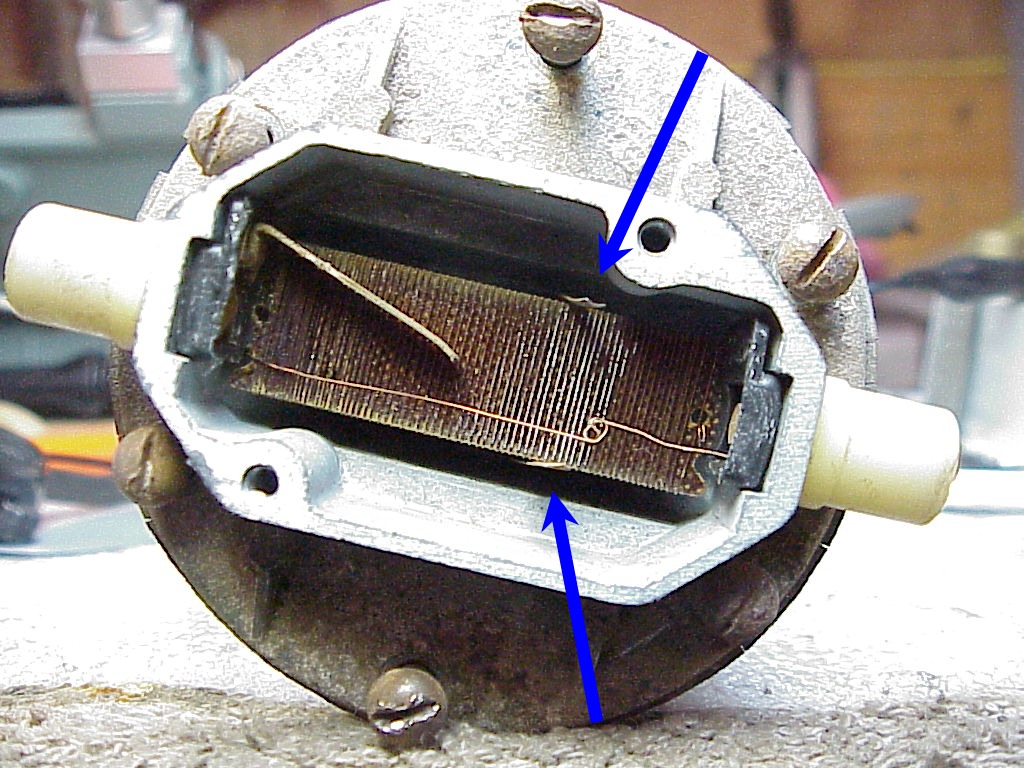 First I wanted to check the sending unit before installing it. The wires to it had been cut right at the unit. I couldn't understand why they weren't unplugged, but probably someone was taking out the tank and didn't realize that they needed to open the access port under the rear window to unplug them. Then as the tank was lowered, it was hung up with the wires and someone just reached up and cut them. So I unsoldered the plugs and soldered them onto the wires from the harness. At least they were cut close enough that I didn't have to add any new wire. Next was testing the sending unit. First I used an ohm meter to check conductivity and see if the resistance changed as I moved the float up and down. The readings were pretty intermittent so I opened the top. You can see the wires wound around the center core. The arrows point to the slides that measure the resistance. When the top slide moves all the way to the left it contacts the copper bar that you see running diagonally on top of the core. This turns on the low fuel light.