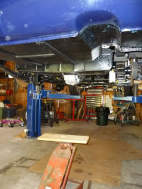 I put the tank on a floor jack and a combination of lowering the car on the lift and raising the jack got the tank in the proper place. Once there, I added the lower rubber washer, steel washer, castellated nut and cotter pin to each corner. It is much easier to bolt down each corner on this car compared to the 330.