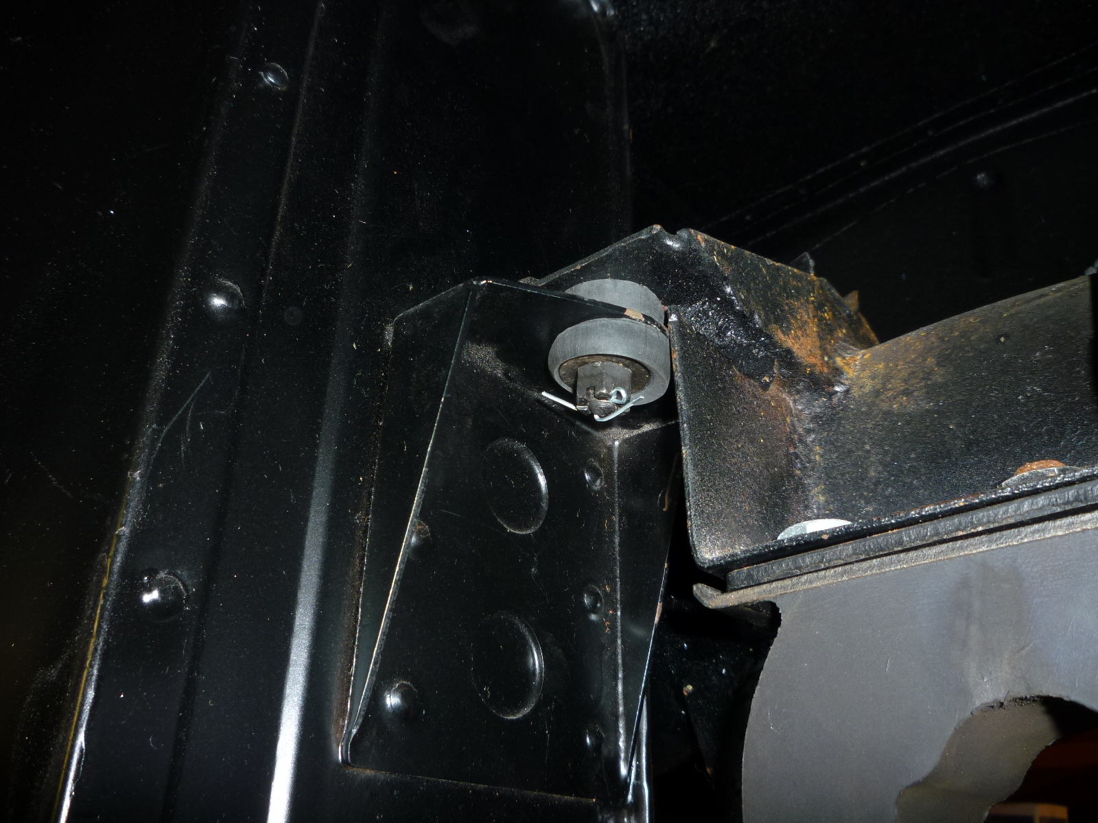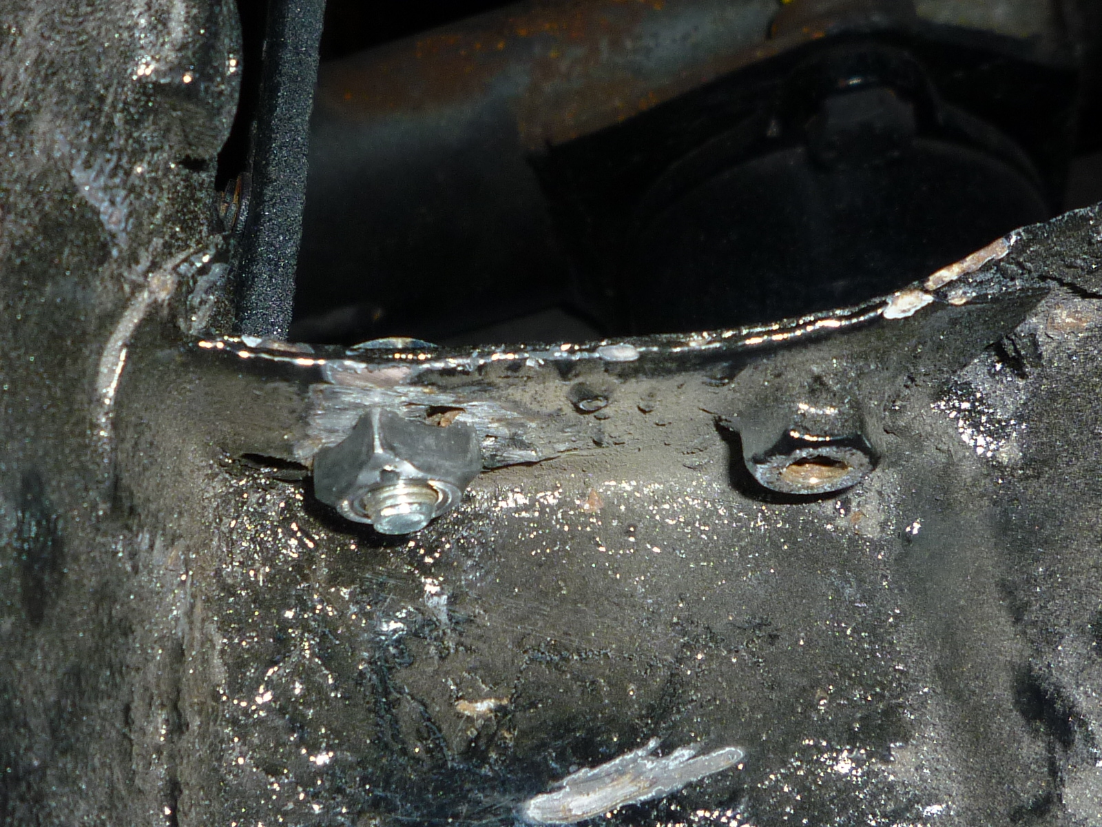 The last thing to do was to fit the support to the car and drill the holes for the bolts. To start, I got out a 5mm tap and ran it through the welded on nuts to clean out the threads. Then I put a couple of bolts though the nuts from the backside so I could tap on the support to see where the screws touched in order to find the hole locations. As I was doing this, I realized that the 5mm bolts weren't tight and that the nuts were actually 6mm. So another tap and start over. As I was running that tap through one of the nuts, that nut tore loose from the sheet metal.