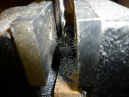 I installed the fuel tank today. One of the things I had to do was to drill the holes for the cotter pins in the bolts that hold the tank on. I was able to hold them in the machinist vise on my drill press. By putting the castellated nut on the bolt and threading it to where I wanted the hole, the bolt and nut set on a thin piece of wood and the vise gripped the corners of the bolt and nut to hold it in place. Then it was just a matter of adjusting the vise so the drill bit was in the proper place.