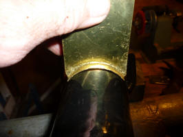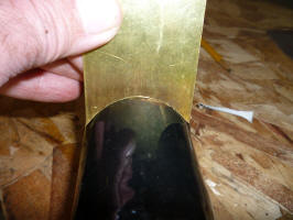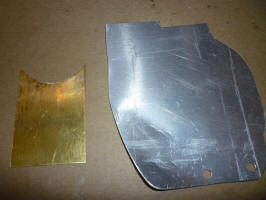 I originally thought that the support would be attached to the pipe, but then I realized that you wouldn't be able to install the pipe if it was attached as the pipe has to move into the filler area in order to clear the end of the pipe into the tank. Before I figured this out, I started making the support out a a piece of brass as it would have been easy to solder it onto the brass pipe. I cut a cardboard template to fit the area and then cut the brass to the approximate dimensions. Before I got the picture, I had already made an aluminum plate to cover the whole hole, another waste of time.