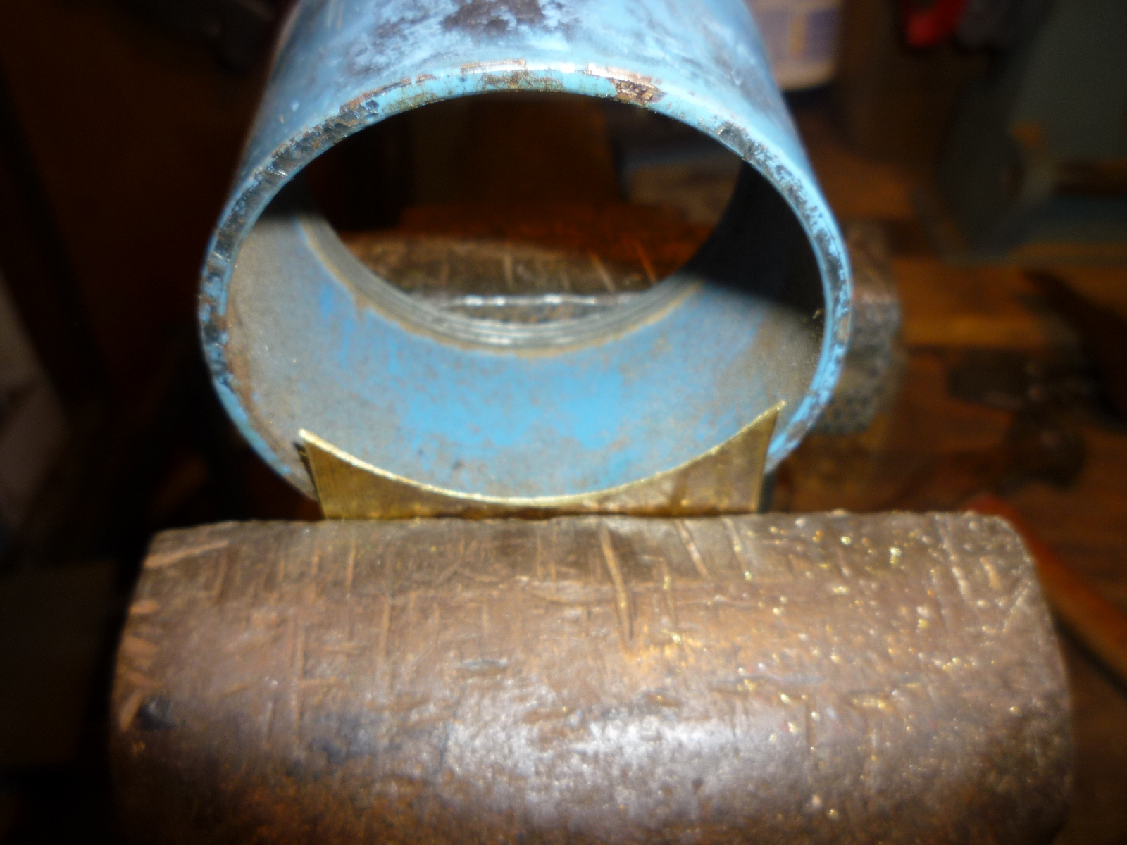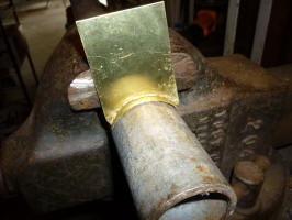 Once the sizing was close, I needed to make the support for the filler pipe to rest on. I looked around and found an attachment for the hydraulic press that I could use as a form. After the initial forming, I used a pipe that was about the right diameter to finish the forming.