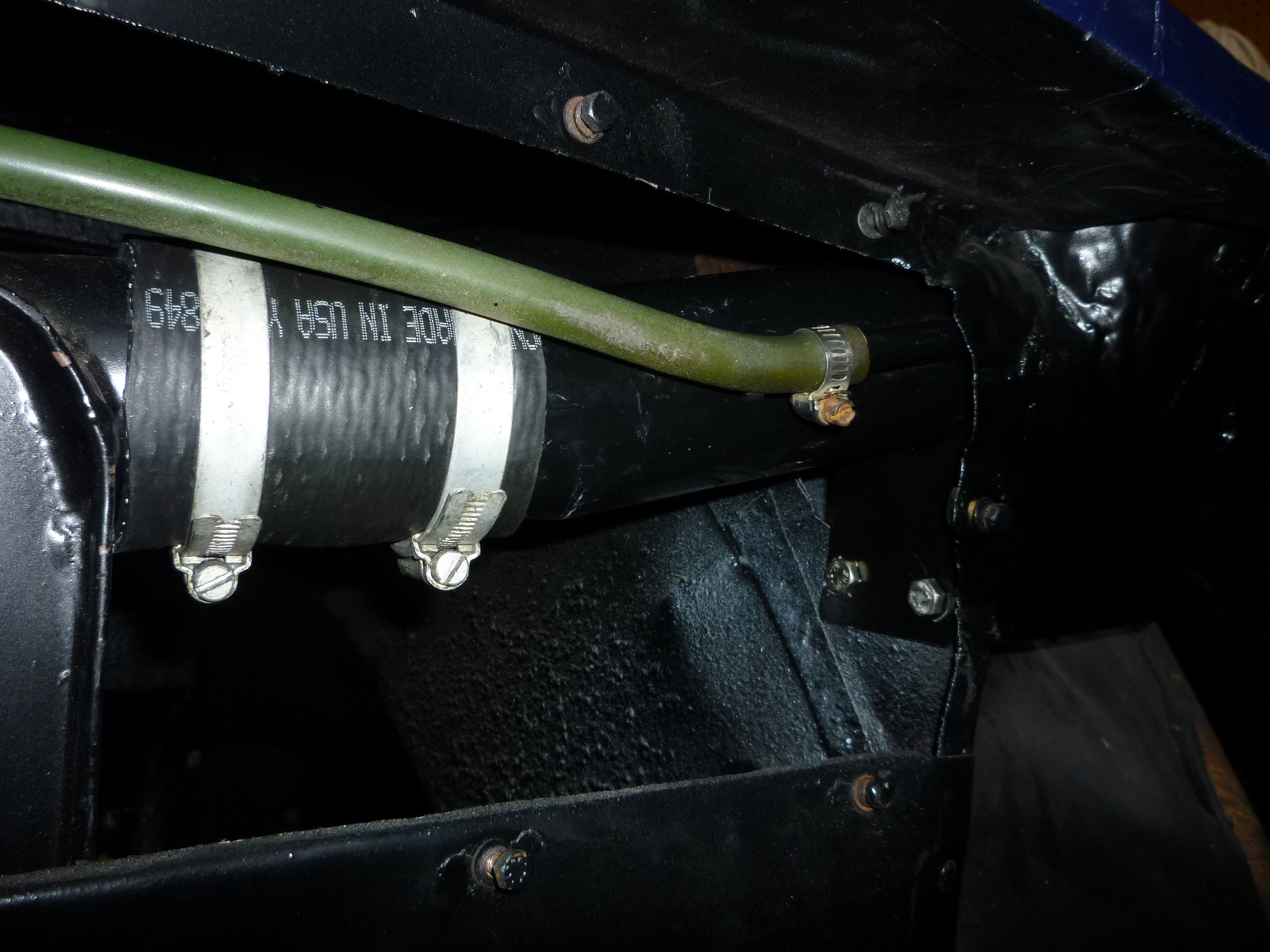 I had gotten a foot of 2 ¼" fuel hose the other day. That was the closest size to the 55mm needed. Since the two pipes slip together, only a 4" section is actually needed. I used Cheney clamps on the ends to make sure that the connection was tight. The vent line looked to be original and was very stiff. However, a minute or so with a hot air gun softened it enough to slip onto the vent on the filler pipe. Even though there was no sign of clamp marks on either end, I put a small screw clamp on each just to make sure that there would not be a leak if the tank was filled up into the filler neck. Once that was all done, I put in the support piece.