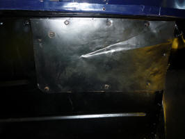 It turns out that that opening did not have a plate. There were two welded nuts along with a drain hole at the bottom. The nuts are for bolts that hold a support for the filler neck. Chris Coios sent me this picture that shows what I need to make.