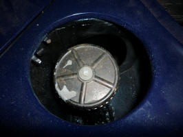 The hole for the sending unit and the filler tube had been covered with wide masking tape. That's a great idea if one is going to remove it in a short time. But after years, it gets very difficult to remove. It took quite a bit of time and rubber cement thinner to get it off. I use rubber cement thinner to remove about any sticky substance. I've never had it affect paint, plastic or anything else.